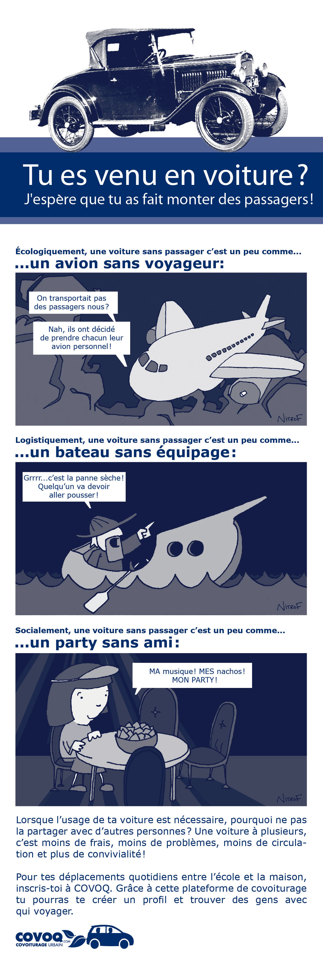 En revenant à votre voiture, vous croyez avoir eu une contravention… mais non! Bonne nouvelle, c’est seulement une bande-dessinée qui parle de covoiturage!